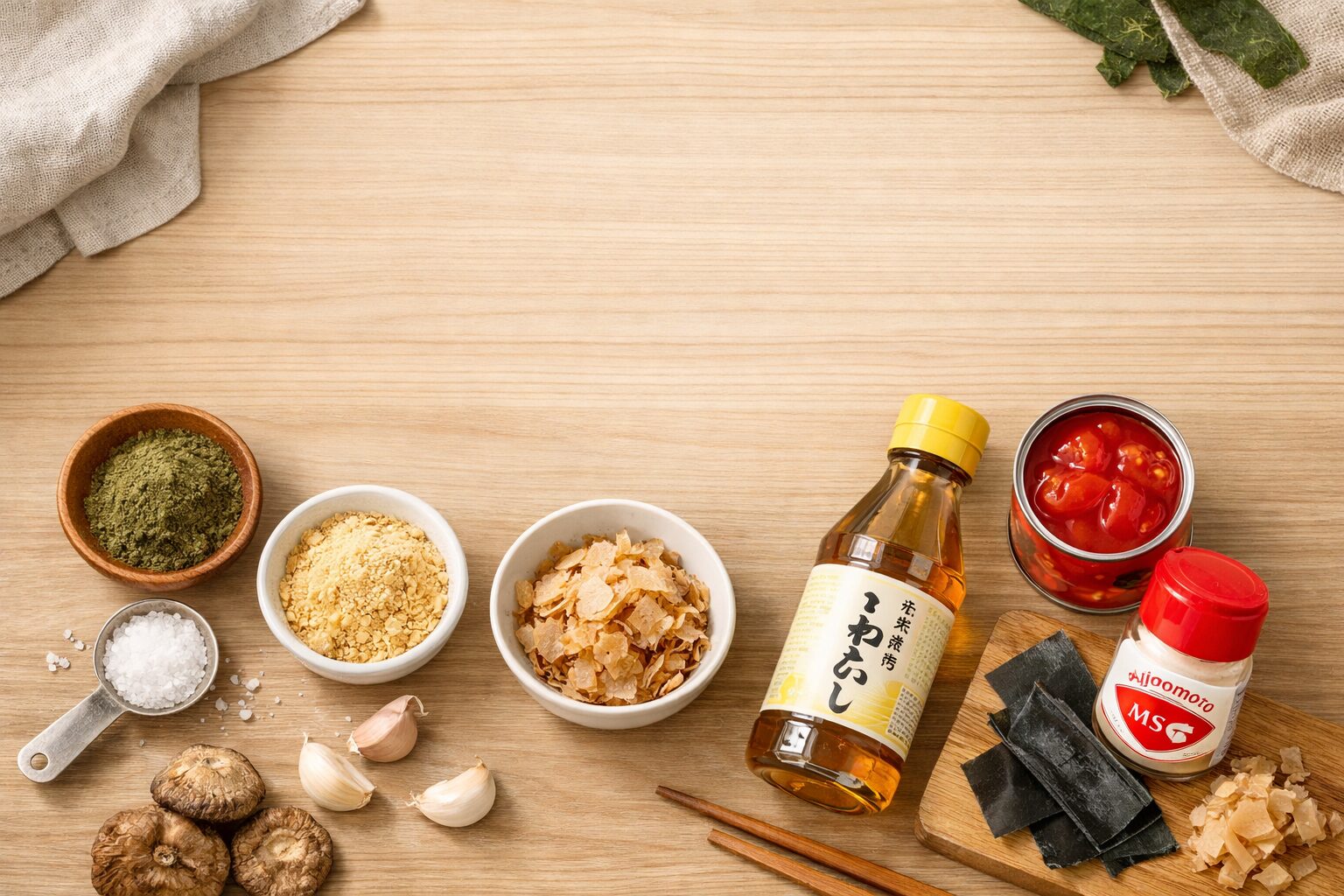 ここまでの基本セットを並べると、結局は家にあるものを、料理ジャンルの方向に合わせて選ぶのが最短です。昆布茶は和の汁もの、白だしやだし入り味噌は和の土台作り、鶏がらや中華だしは中華寄せ、トマト缶は洋食寄せ、味の素は汎用。こう整理しておくと迷いが減ります。