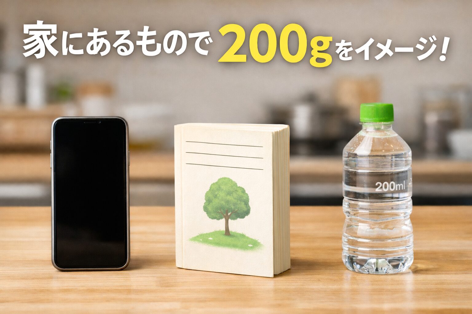 たとえば、片手でふつうに持ち上げて「軽い」とは言いにくいが「重すぎもしない」と感じる、その中間の感覚が200gのイメージに近づきます。料理中に「この袋、だいたい200gかな」と迷ったときに、スマートフォンを一瞬持ってみて感覚を合わせるだけでも、判断が落ち着くことがあります。
