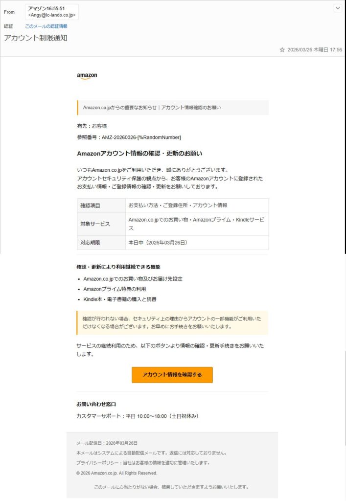 今回のメールでは、表示名に「アマゾン」と入っているものの、実際のメールアドレスはAngy@ic-lando.co.jpとなっていました。通常、公式の案内であれば、企業名やサービスに関連した送信元で届くことが多いため、本文内容と関係の薄いドメインには注意が必要です。