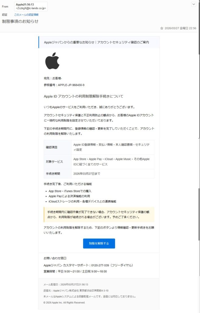 特に、送信元として表示されていたApple21:56:13 / ZczkgX@ic-lando.co.jpのような情報は、不審メールを見抜く重要な手がかりになります。件名や本文がもっともらしくても、送信元に違和感がある場合は慎重に対応するべきです。