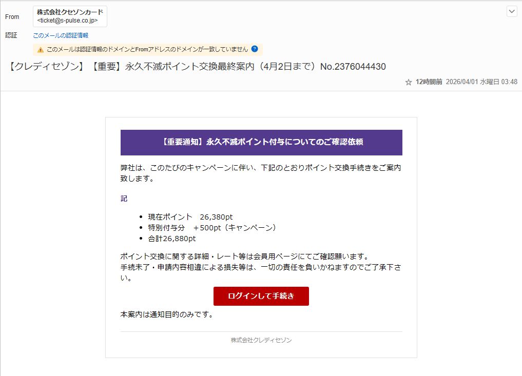 今回の「【クレディセゾン】【重要】永久不滅ポイント交換最終案内」のようなメールは、ポイント交換や期限切れへの不安を利用して、受信者を偽サイトへ誘導しようとする典型的なフィッシングメールとして注意が必要です。