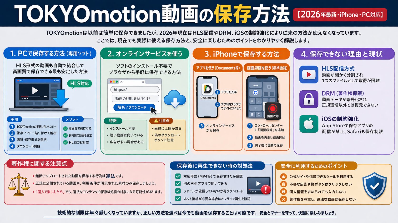 TOKYOmotionの動画が保存できなくなった理由は、HLSやDRMといった技術の進化と、iOSをはじめとするデバイス側の制約強化が重なった結果です。以前から使い慣れたClipboxやChrome拡張機能は現在ではほぼ機能せず、一部はセキュリティリスクも伴います。