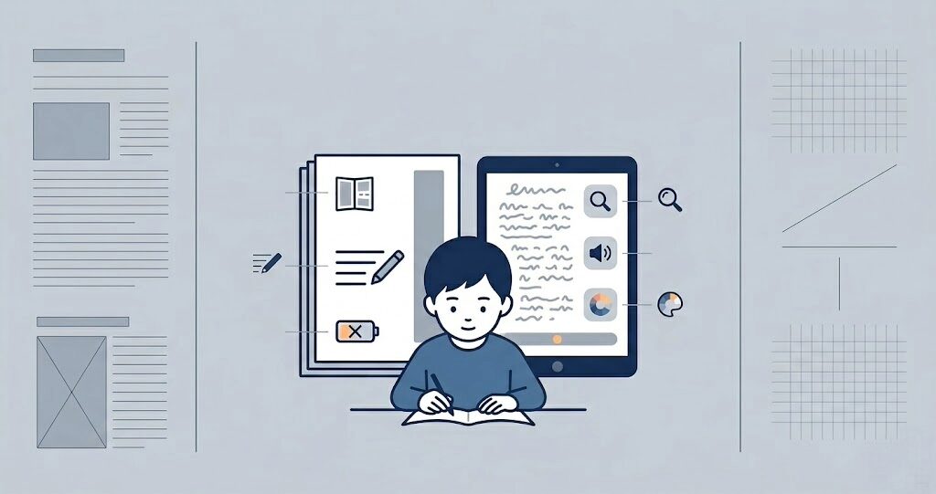 第二に、対象の問題です。学習障害や読み書き困難の当事者にとっては、文字の拡大、背景色の調整、読み上げ機能などが学習参加そのものを左右する場合があります。一方で、すべての子どもにとってデジタルが常に最適だとは限りません。長文の読みやすさ、板書との往復、手を動かして覚える感覚など、紙の強みが残る場面もあります。だから本来は、全体導入か全面否定かではなく、誰にどの条件でどちらが有効かを切り分ける必要があります。