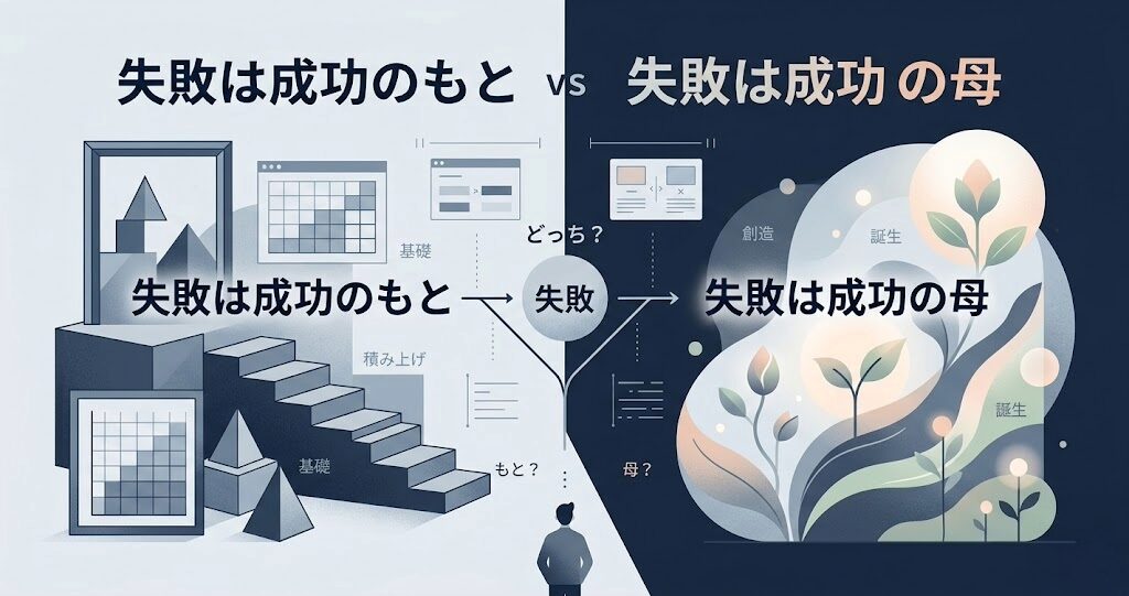 「失敗は成功のもと」と「失敗は成功の母」は、どちらも「失敗があるからこそ成功できる」という考え方を表す表現です。ただし、比喩の方向性と日本語としての定着度には差があります。