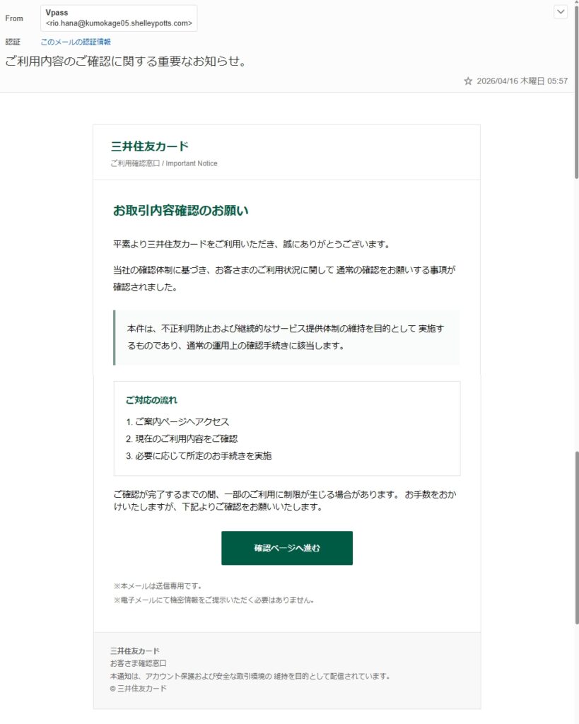 今回の「Vpass ご利用内容のご確認に関する重要なお知らせ。」のようなメールは、利用確認や不正利用防止を名目に、受信者を確認ページへ誘導しようとする不審メールとして注意が必要です。